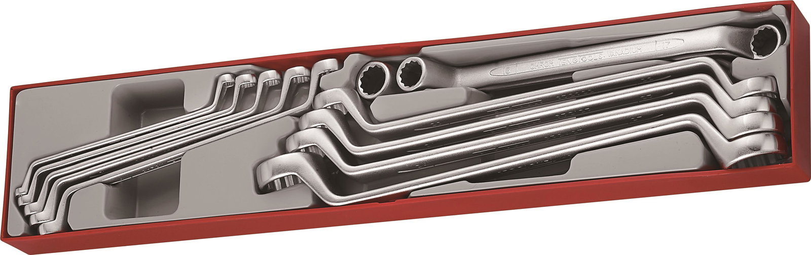 Ze stali chromowo-wanadowej. Dwustronne, z dwunastokątnymi oczkami o niejednakowych rozmiarach. Wymiary wg DIN 838/ISO 3318. Chromowane na mat. Pasuje do skrzynek i wózków narzędziowych Teng Tools.