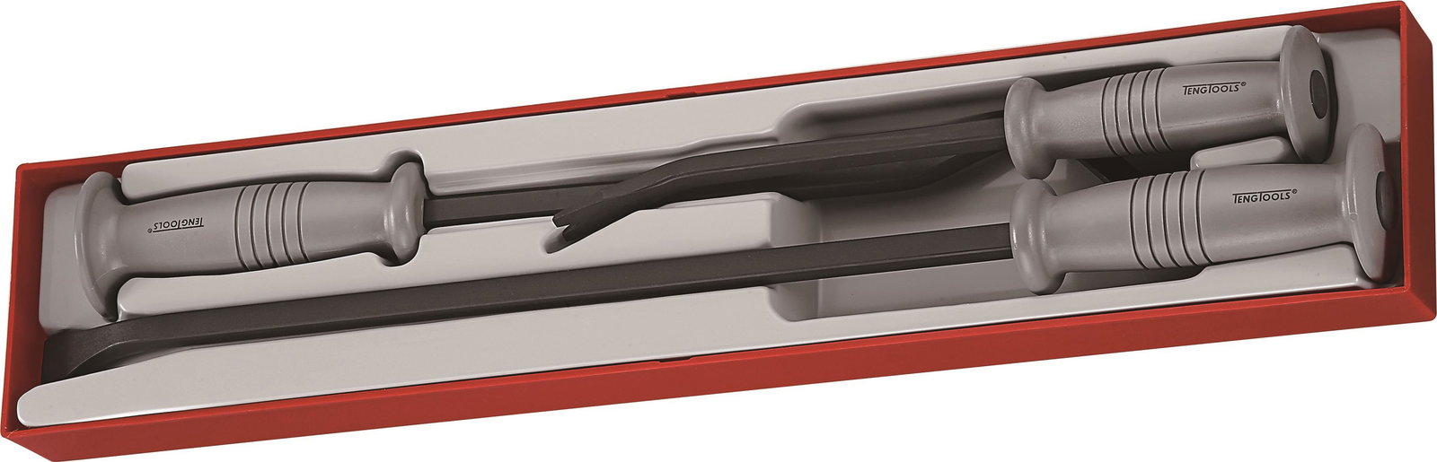 Składa się z 3 łomów. Każdy posiada prosty trzon z płaskim zakończeniem do uderzania, oraz ergonomicznie ukształtowaną rękojeść plastikową. Pasuje do skrzynek i wózków narzędziowych Teng Tools.