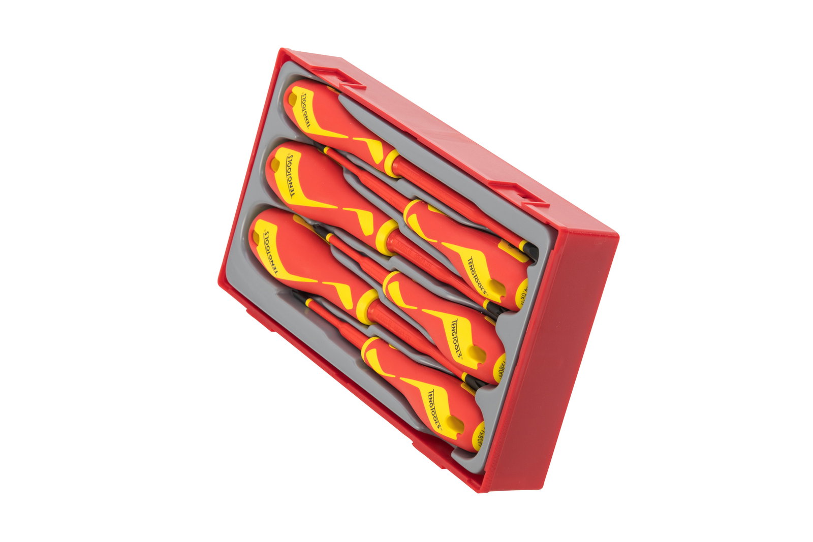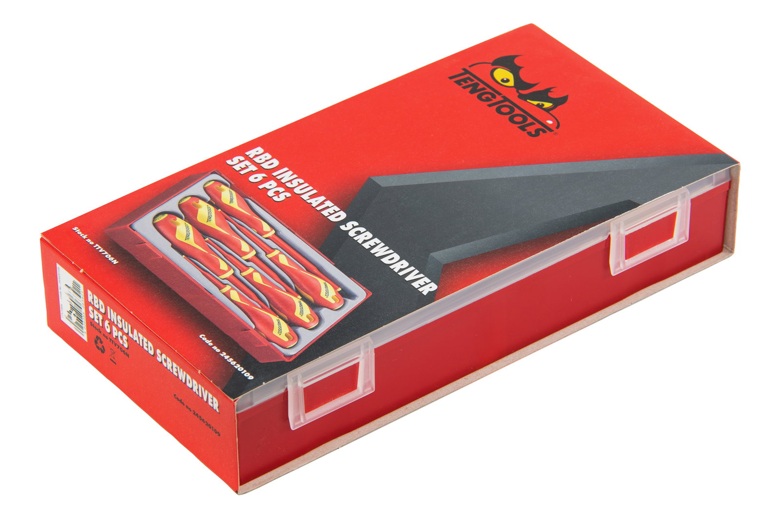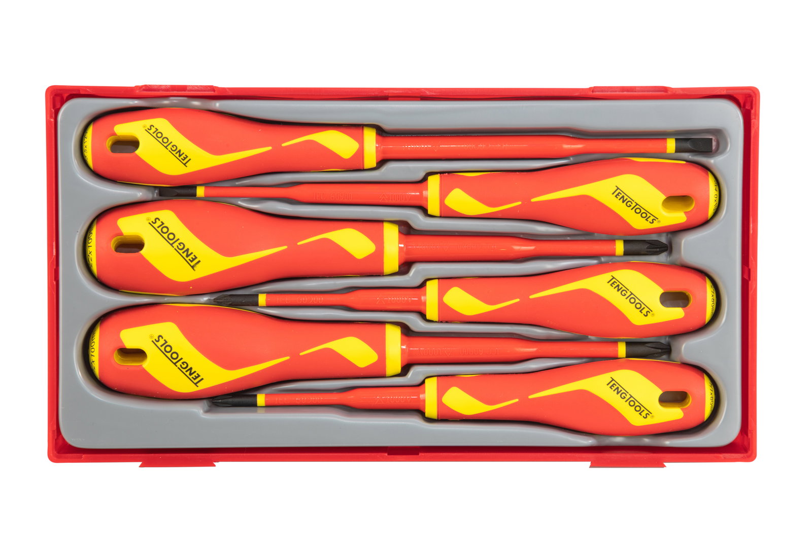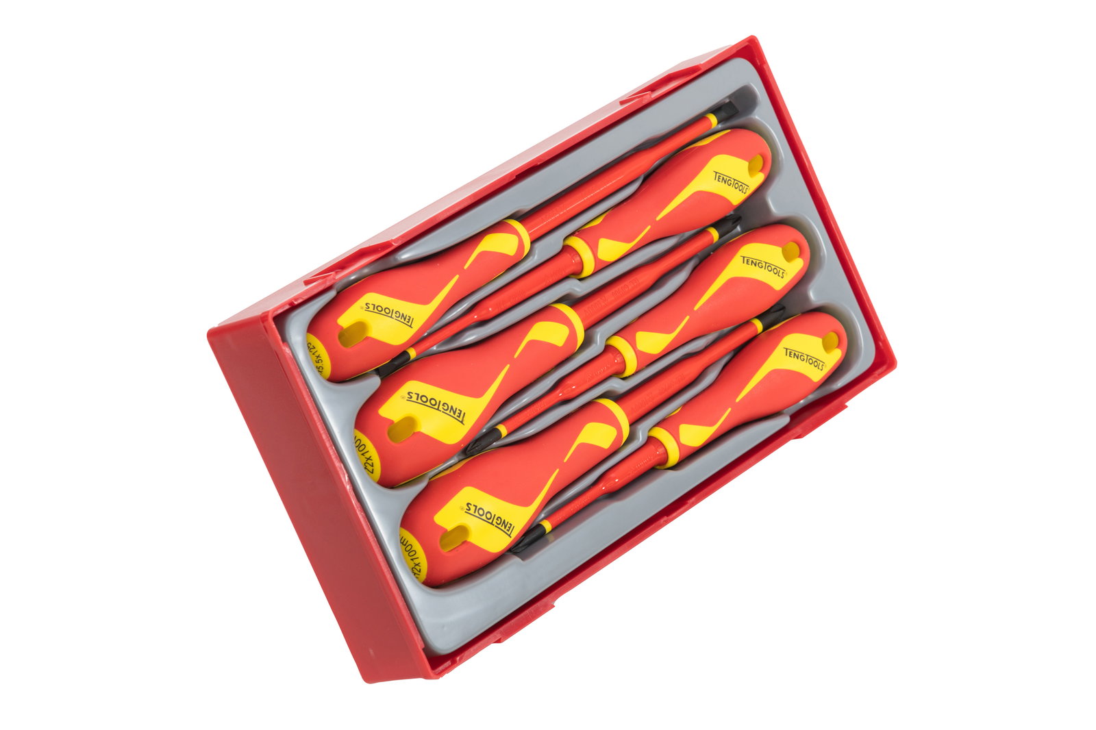 Zestaw zawierający 6 izolowanych wkrętaków (płaskich oraz krzyżowych Phillips i Pozidriv), wykonanych zgodnie z normą IEC 60900 do prac pod napięciem do 1000V (przez specjalnie przeszkolony personel). Osłona izolacyjna jest zintegrowana z trzonem w taki sposób, że jest on lekko zbieżny i szczególnie cienki w okolicy grotu, a przez to zapewnia bardzo dobrą dostępność i funkcjonalność. Dostarczany w pojemniku z tworzywa sztucznego z odłączaną pokrywą. Pasuje do skrzynek i wózków narzędziowych Teng Tools.