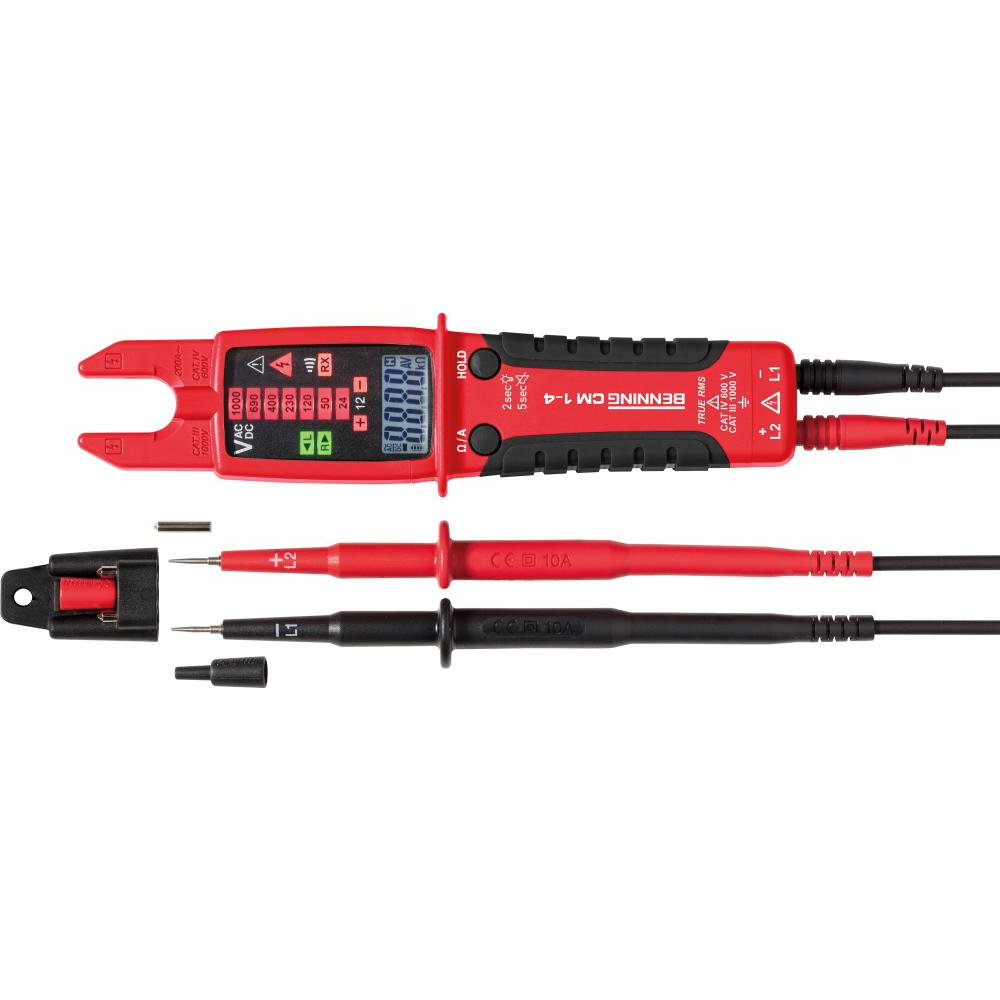 CM 1-4, otwarty miernik cęgowy z dodatkowym ledowym wskaźnikiem stopni. Precyzyjny dzięki metodzie mierzącej rzeczywiste wartości skuteczne TRUE RMS. Dodatkowo nadaje się do sprawdzania kierunku pola wirującego, fazy i polaryzacji, jak również do jednoręcznego sprawdzania napięcia w gniazdach. Wskaźnik napięcia od 50 V nawet przy rozładowanej baterii. Dostawa wraz z kaburą na pasek, bateriami i zestawem przewodów pomiarowych z powiększeniem końcówki pomiarowej i osłoną końcówki.