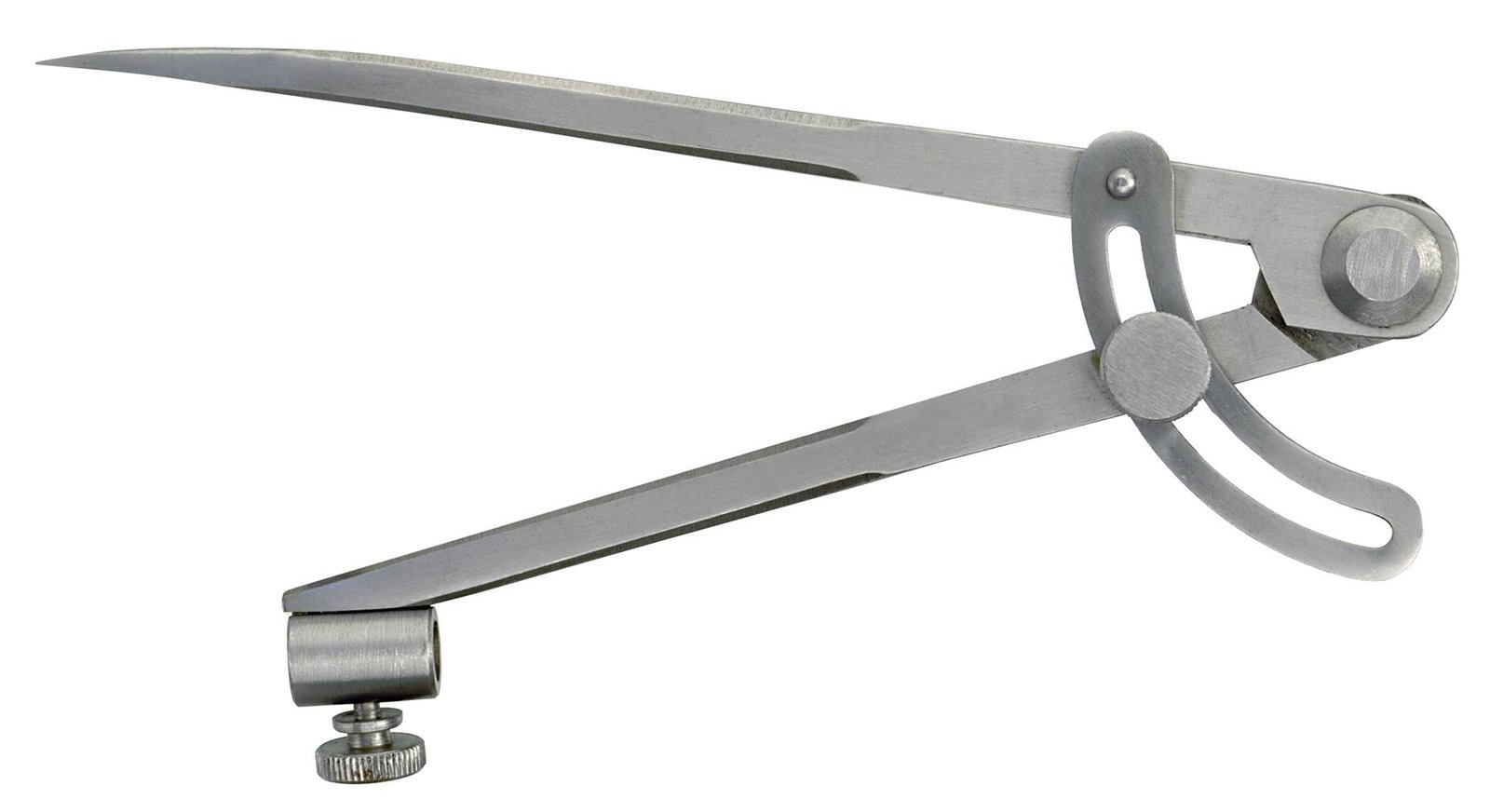 Cyrkiel. Ze stali. Ramiona o przekroju prostokątnym. Z zewnętrzną prowadnicą łukową i oprawką do ołówka. Dostarczany bez ołówka.