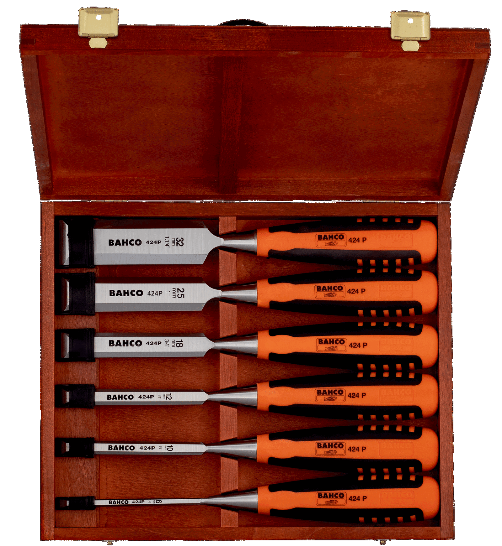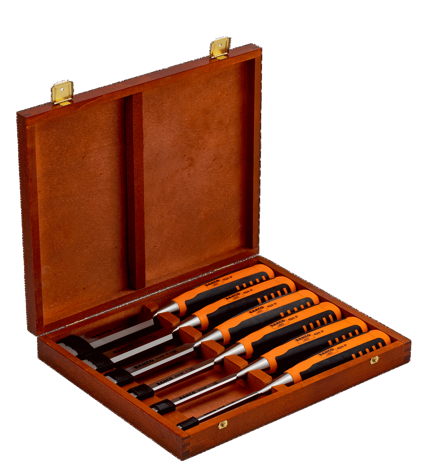 Dłuta profesjonalne z dwuskładnikową rękojeścią, 6 szt., w pudełku drewnianym BAHCO