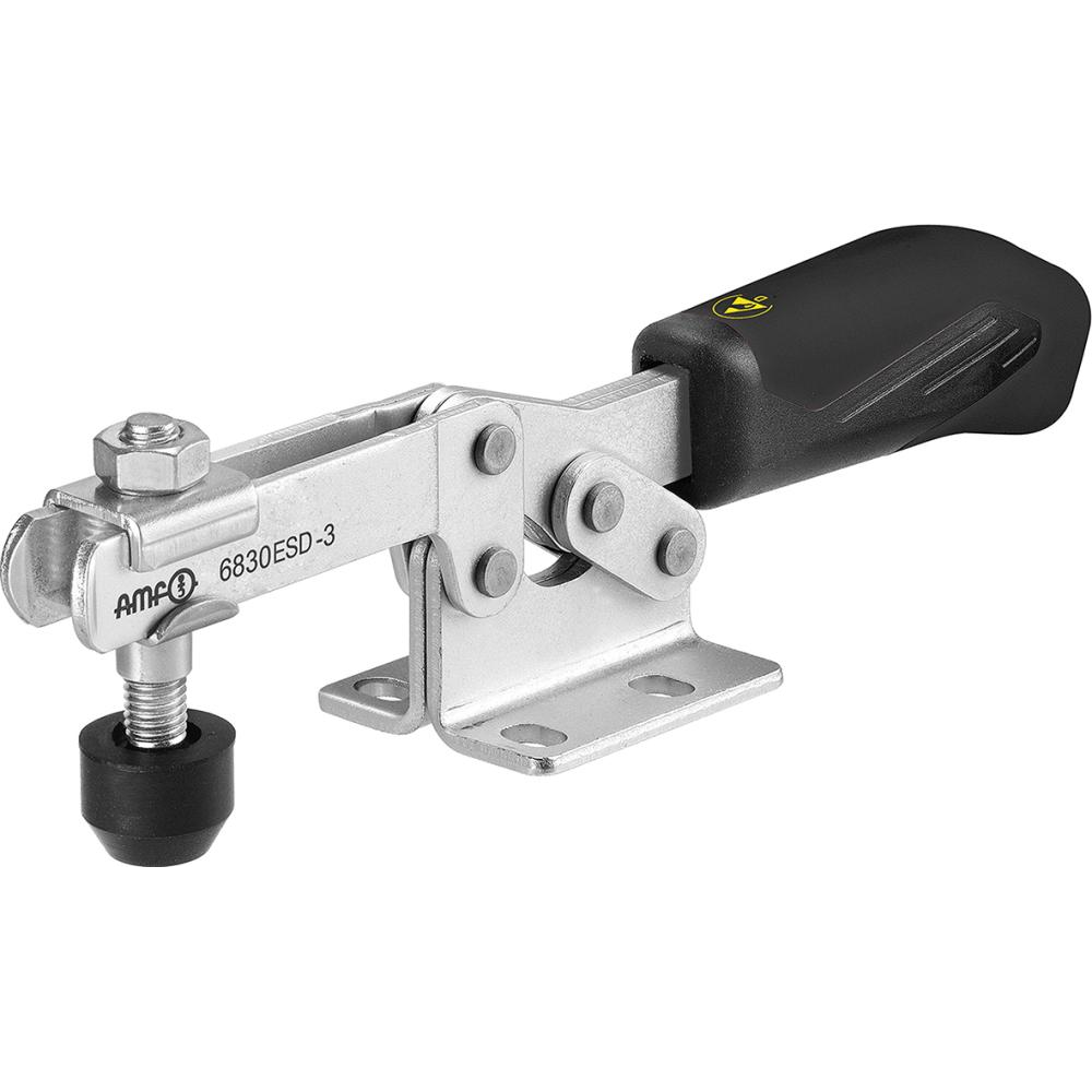 Wykonanie: z nasadką ochronną i rękojeścią z materiału odprowadzającego ładunki elektrostatyczne. Docisk szybkomocujący pionowy, z otwartym ramieniem dociskowym i stopą poziomą. Ocynkowany i pasywowany. Nity ze stali nierdzewnej, które w wielkościach 2 i 3 poruszają się w tulejach łożyskowych utwardzanych dyfuzyjnie.