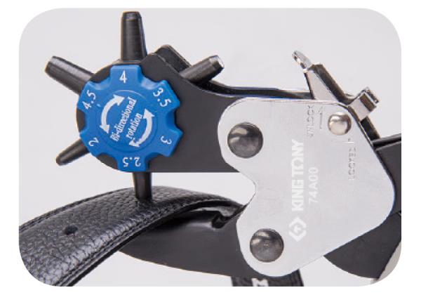 Do dziurkowania skóry, tekstyliów i tworzyw sztucznych. Obrotowa głowica stalowa posiada unikalny system zbierania odpadów. Sześć wymiennych stempli: 2,0 / 2,5 / 3,0 / 3,5 / 4,0 / 4,5 mm Karta produktu – 74A00