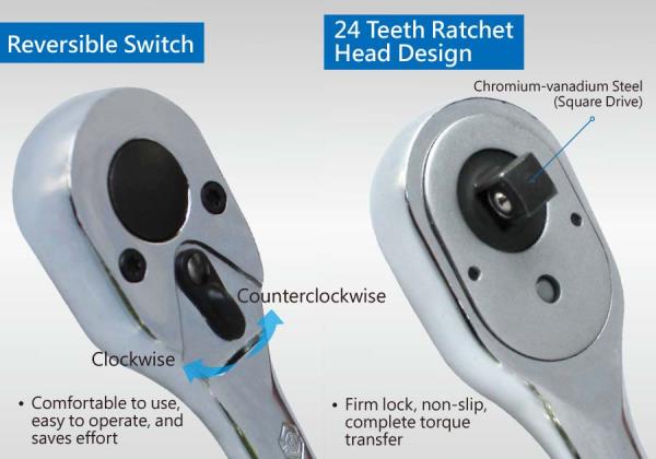 Grzechotka 1/4″ King Tony. Rączka wykonana ze stali chromowo-wanadowej, polerowana i chromowana. Wkład ze stali molibdenowej. 24 zęby, przeskok co 15 stopni obrotu. Uchwyt polerowany. Długość 140 mm Karta produktu – 2769-55P