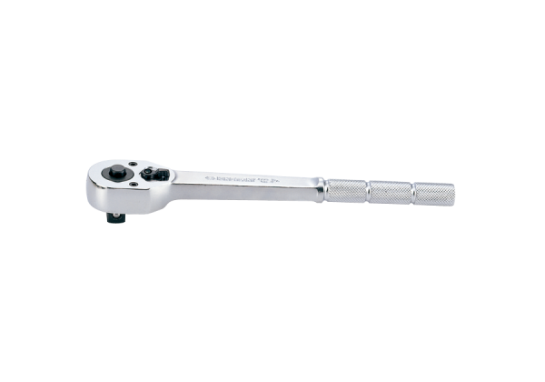 Grzechotka 1/2″ King Tony z przyciskiem ułatwiającym zdejmowanie nasadki. Grzechotka posiada w swoim mechanizmie 32 zęby, co umożliwia pracę co 11 stopni obrotu. Korpus wykonany ze stali chromowo-wanadowej, polerowany i chromowany, mechanizm ze stali chromowo-molibdenowej. Całkowita długość 250 mm, uchwyt z nacięciami umożliwiającymi użycie przedłużki. Karta produktu – 4771-10BR