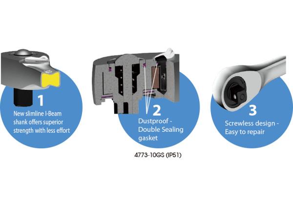 Dwukierunkowa grzechotka wyposażona w przełącznik kierunkowy lewo-prawo.Mechanizm zapadkowy grzechotki wyposażony w 90 zębów, skok co 4°.Wyposażona w przycisk do mocowania i szybkiej wymiany nasadek. Ergonomiczny, antypoślizgowy, wyprofilowany uchwyt ułatwiający pracę podczas dokręcania. Długość grzechotki 250 mm.Stopień ochrony IP5.Narzędzie zgodne z normą DIN 3122. Karta produktu – 4773-10GS