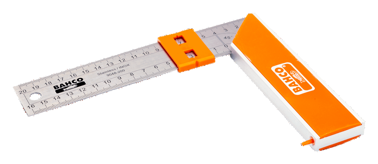 - Kątownik rzemieślniczy z dodatkowym przesuwnym wzdłuż skali znacznikiem do łatwego odmierzania