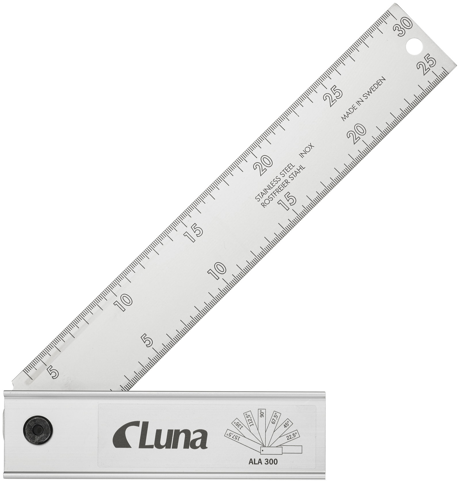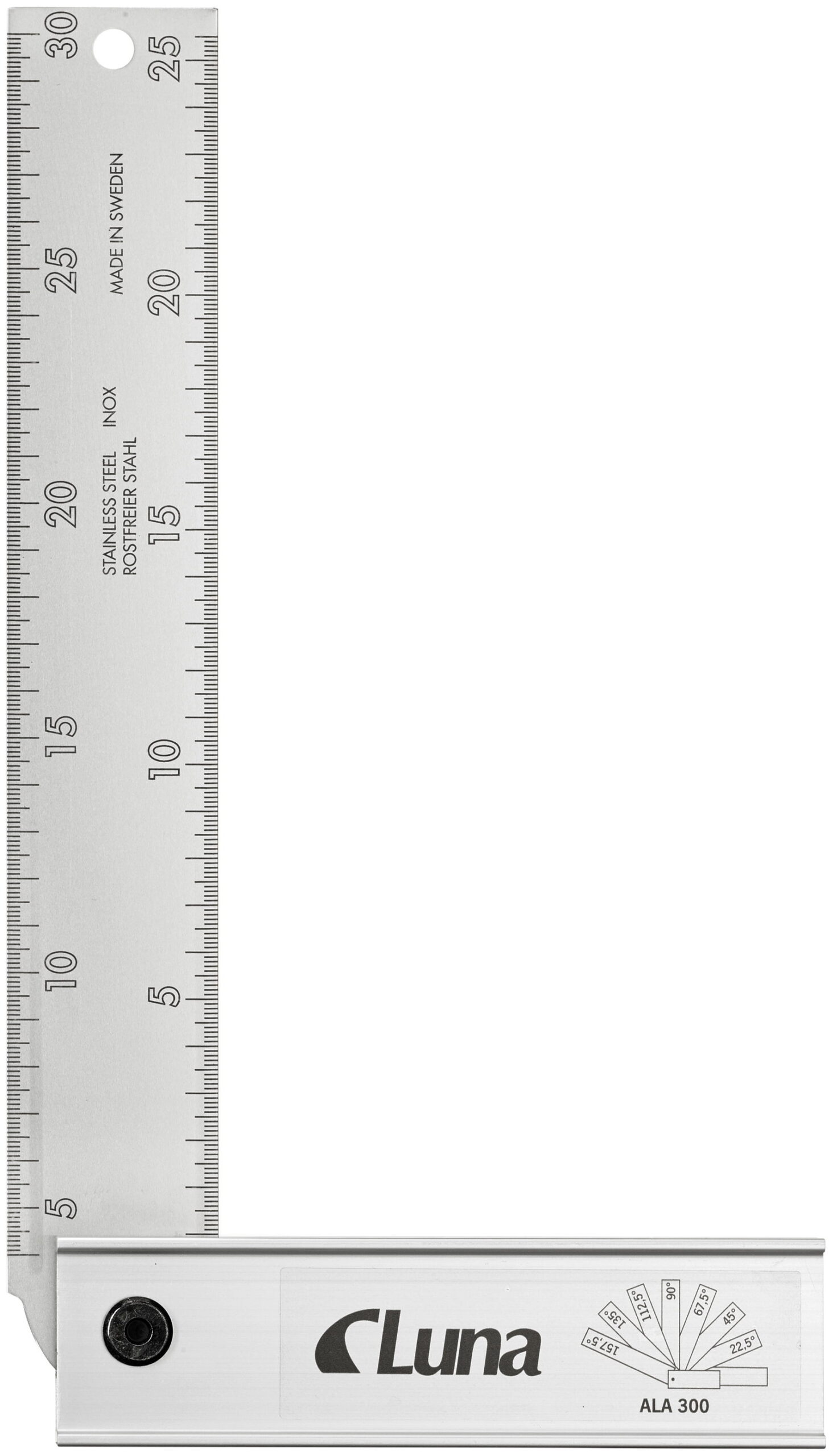 Kątownik nastawny z 8 pozycjami ustalanymi z wykorzystaniem mocnych zatrzasków sprężynowych w odstępach co 22.5 stopnia, od 0 do 180 stopni. Ramię długie ze stali nierdzewnej, z głęboko trawioną podziałką mm po obu stronach. Szerokość przykładni wynosi aż 18 mm, co zwiększa stabilność, a także umożliwia kontrolę np. struganych kantówek wymiarowych z zaokrąglonymi krawędziami. Otwór do dołączenia zabezpieczenia narzędzia.
