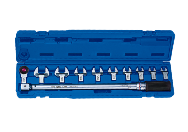 Zestaw klucza dynamometrycznego z wymiennymi głowicami. W komplecie klucz 40~200Nm, grzechotka 1/2″ oraz końcówkami płaskimi w rozmiarach 13, 14, 15, 17, 19, 22, 24, 27, 30 mm. System zmiennych głowic umożliwia dokręcenie śruby, do której nie ma dostępu od góry, z zadaną siłą przy pomocy końcówki płaskiej bądź oczkowej. Karta produktu – 345202D11MR