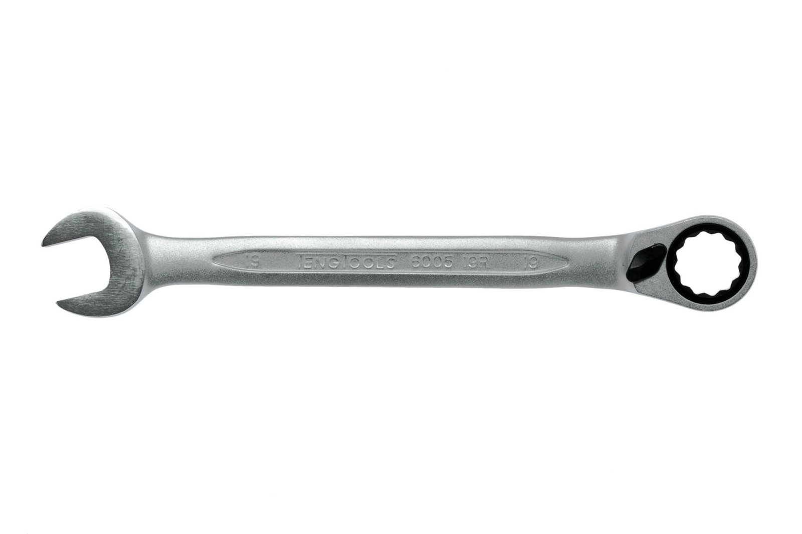 Ze stali chromowo-wanadowej. Klucz na jednym końcu wykonany jako oczkowy wygięty, a na drugim jako oczkowy 12-kątny, zapadkowy. Funkcja zapadkowa z przełączanym kierunkiem pracy prawo-lewo. Główka 12-kątna jest odgięta o 15°. Na obu końcach ten sam rozmiar. Chromowane na mat.N