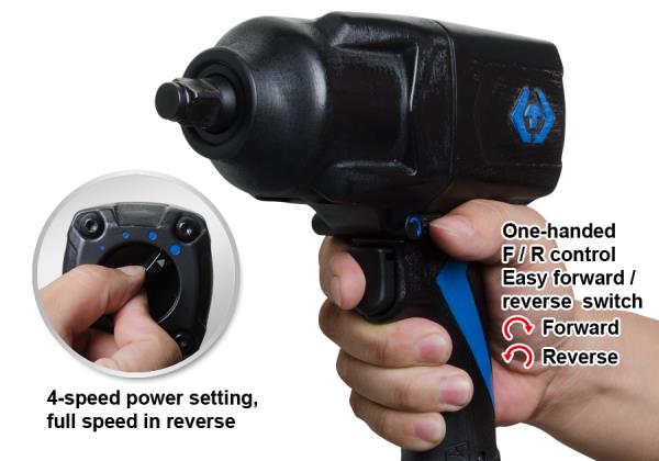 Klucz udarowy kompozytowy 1/2″ King Tony. Prędkość obrotowa 8000 obrotów na minutę. Średnie zużycie powietrza 190 l/min . Maksymalny moment obrotowy 1288 Nm. Waga 2,25 kg, długość 197 mm. Karta produktu – 33481-095