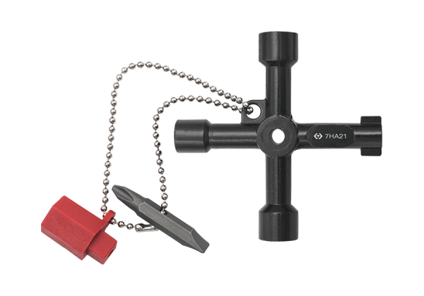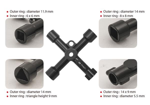 Klucz do szaf rozdzielczych gazowych, wodnych i elektrycznych. Przydatny przy klimatyzacji, wentylacji i tablicach rozdzielczych. Umożliwia dostęp do szaf przy różnorodnych systemach zamknięć. W zestawie:- 2 końcówki kwadratowe 6 i 8 mm,- końcówka trójkątna 9 mm,- końcówka łopatkowa 5,5 mm,- adapter do końcówek wkrętakowych 1/4″,- dodatkowa końcówka wkrętakowa dwustronna 1.0×7 mm / PH2 Karta produktu – 7HA21