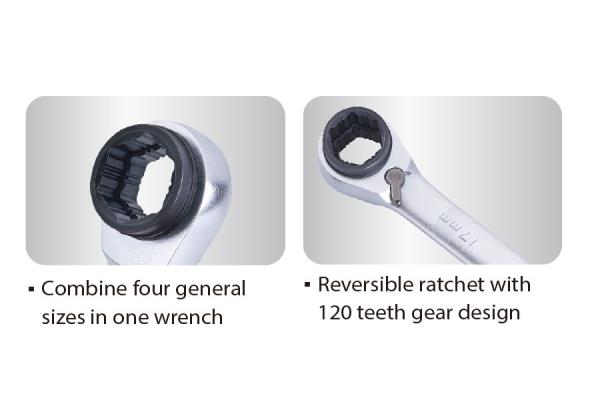 NOWOŚĆ 4 rozmiary w 1 kluczu, Kompaktowy mechanizm zapadkowy z odwracalną funkcją.120-zębowa precyzyjna przekładnia zapadkowa z ruchem 3°. Zęby antypoślizgowe nadają się do śruby zaokrąglonej w 80%.