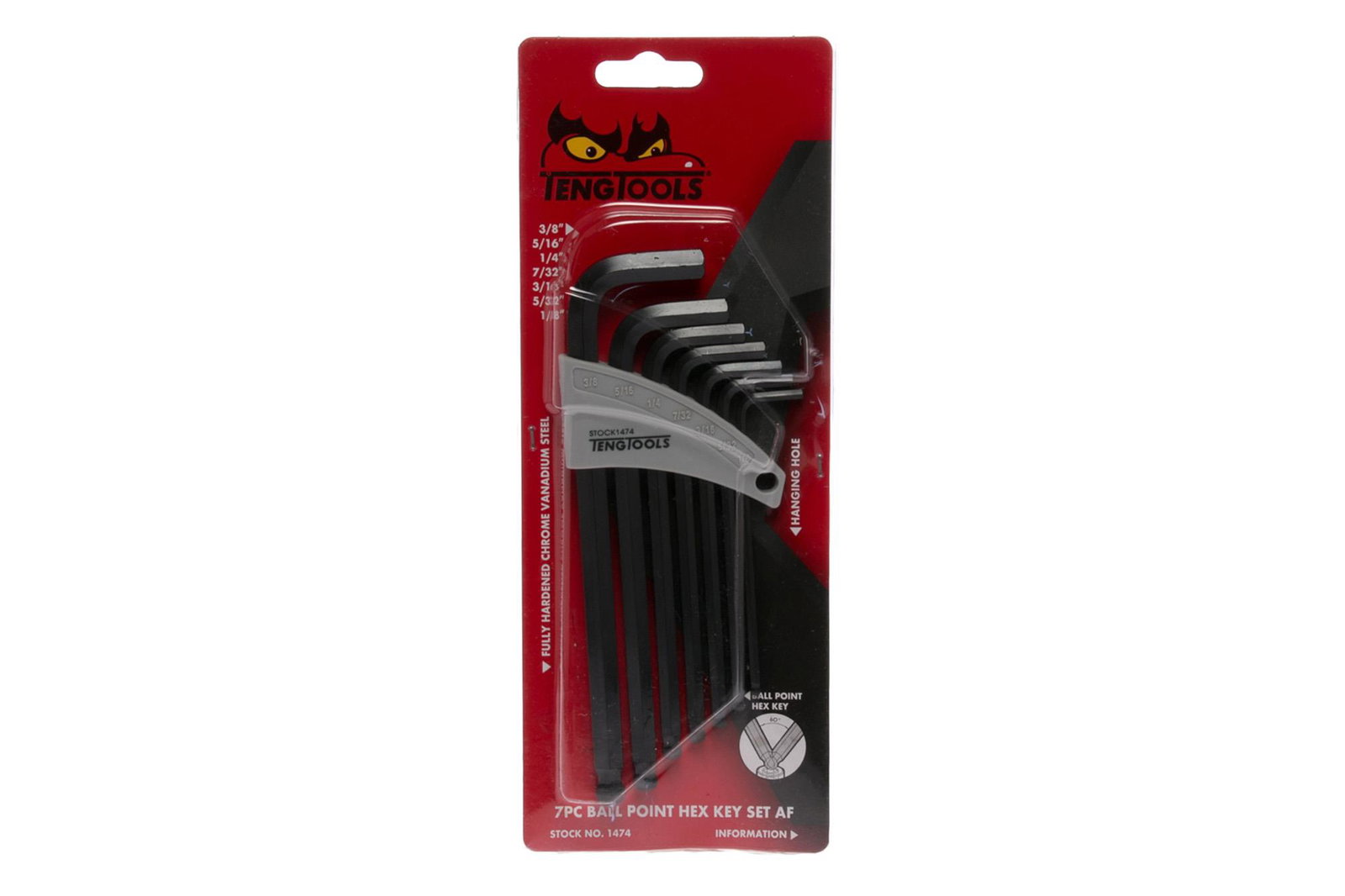 Zestawy zawierające 7 sześciokątnych kluczy trzpieniowych. Ze stali chromowo-wanadowej. Kuliście uformowana końcówka na dłuższym końcu klucza umożliwia pracę przy przechyle. Dostarczane w plastikowej oprawce.