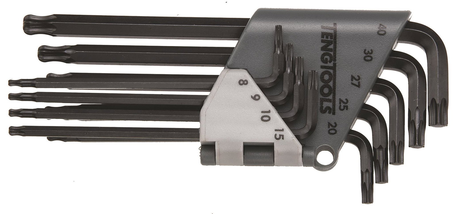 Do gniazd systemu Torx. Dłuższy koniec klucza ma kształt kulisty, umożliwiający pracę przy przechyle do 20°. Ze stali chromowo-wanadowej. W składanym futerale tworzywowym.