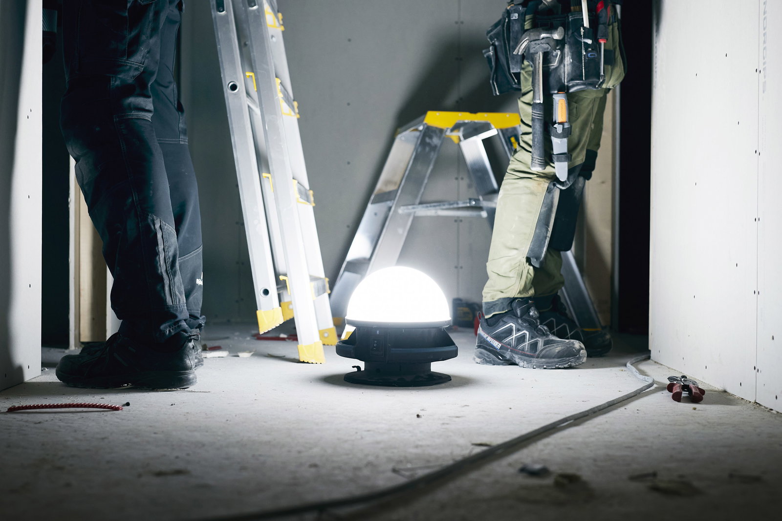 Akumulatorowa lampa robocza ze źródłem światła w kształcie kuli, zapewniającym wyjątkowo dobre rozpraszanie światła w oświetlanej przestrzeni. Lampa jest typu hybrydowego, co oznacza, że można ją zasilać zarówno z akumulatora, jak i poprzez dołączony kabel o długości 5 m. Dla dodatkowego bezpieczeństwa system wyposażono w funkcję oświetlenia awaryjnego, która aktywuje się przy zaniku zasilania. W tej sytuacji następuje 2-3-krotne mignięcie, po czym lampa zapala się i świeci z mocą 50% przez ok. 1 godz. Shine 4500 RE APP może być sterowana przez aplikację smartfonu, pozwalającą na włączanie/wyłączanie, przyciemnianie, korzystanie z układu czasowego (timera). Aplikacja umożliwia na podłączenie w razie potrzeby do 100 urządzeń jednocześnie. Lampa odznacza się wyjątkową odpornością na wstrząsy.