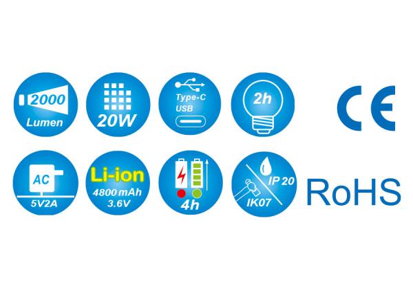 NOWOŚĆ. Biały kolor światła, super jasna dioda SMD, 6500KJasność:Tryb niski: 500 lm / 6,5 godzTryb średni: 1000 lm / 4,0 godzTryb wysoki: 2000 lm / 2,0 godz. Materiał: aluminiowy korpus + PA.Wodoodporność i pyłoszczelność IP20.Odporność na wstrząsy: IK07.Akumulator: litowo-jonowy 3,6 V4800 mAh z gniazdem USB typu C.Ładowarka: USB 110V -240V AC/DC, wyjście: 5V 2A.Akcesoria: Kabel do ładowania USB typu C o długości 1 m. Czas ładowania: 4 godz. Cechy:- trwała obudowa, – uchwyty z gumą i soczewka,- 3-diodowy wskaźnik poziomu naładowania baterii.