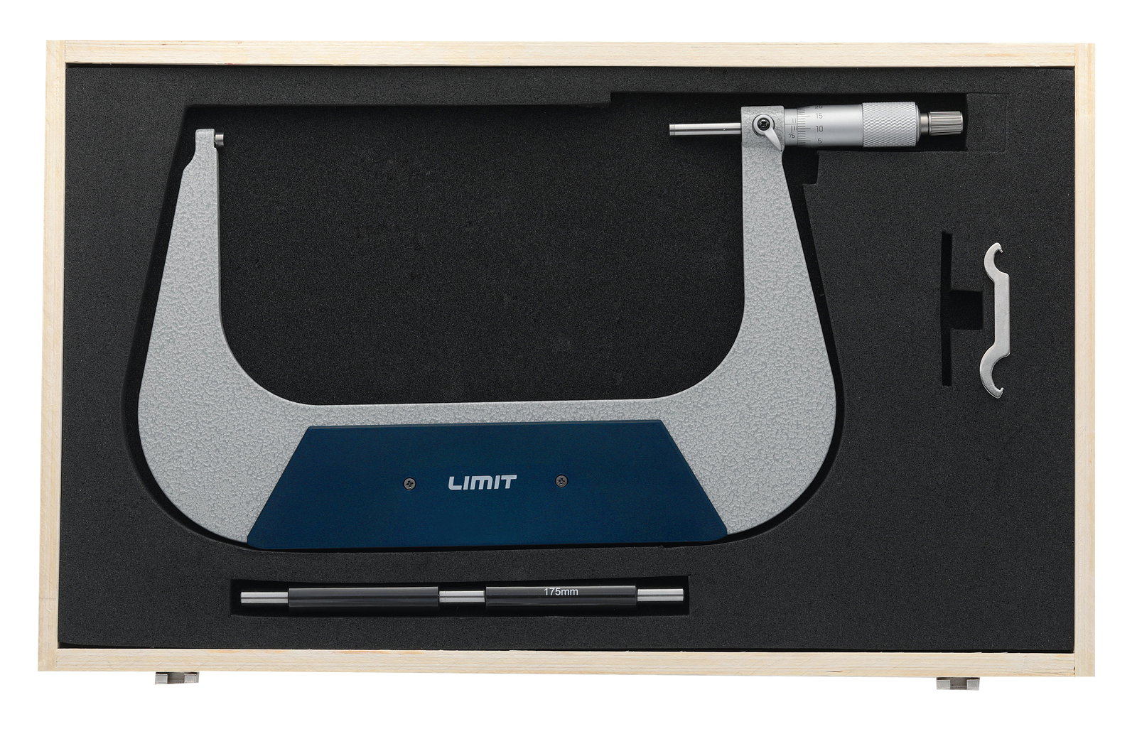Mikrometr z lakierowanym kabłąkiem stalowym i podziałką chromowaną na mat. Hartowane wrzeciono o średn. 6.5 mm z dokładnie docieranymi powierzchniami pomiarowymi z węglików spiekanych. Sprzęgło zapadkowe i dźwignia ustalająca. Wykonanie zgodne z DIN 863.