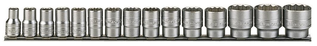 Zestaw 15 nasadek dwunastokątnych ze stali chromowo-wanadowej. Dostarczane na podstawce listwowej z uchwytami sprężystymi, przystosowanej do mocowania na ścianie. Chromowane na mat.