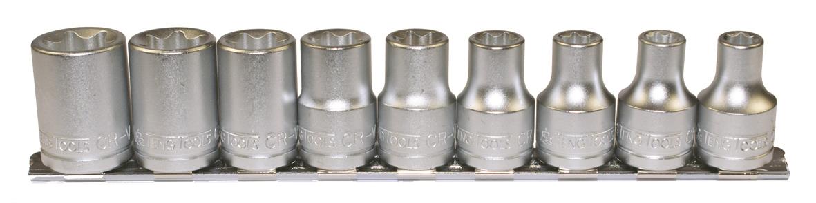 Zestaw 9 nasadek TX-E do łbów z nacięciem zewnętrznym systemu Torx. Zamontowane na podstawce listwowej z uchwytami sprężystymi. Chromowane na mat.