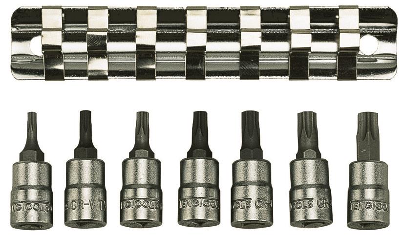 Zestaw nasadki typu TX do łbów z gniazdem typu Torx. Do pracy ręcznej. Dostarczane na podstawce listwowej z uchwytami sprężystymi.