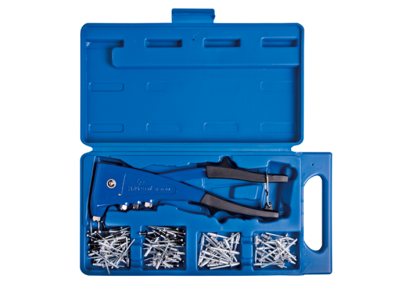 W zestawie nitownica , średnica 2,4 – 4,8 mm i zestaw 6 rodzajów nitów, po 20 sztuk z każdego rodzaju. Karta produktu – 21-20-07MR