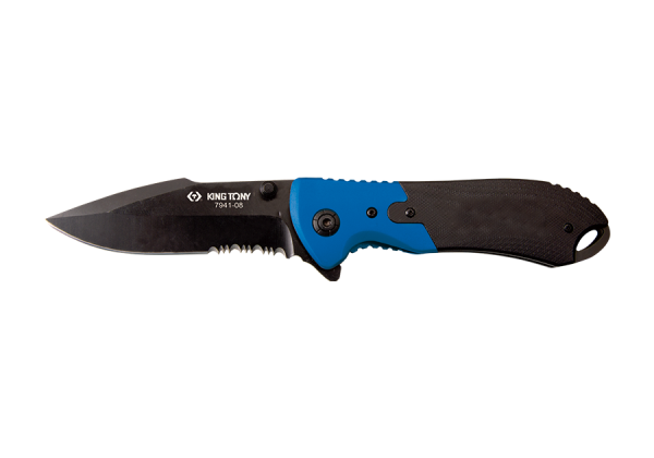Nóż składany z chowanym i blokowanym ostrzem King Tony 7941-08. Długość po rozłożeniu to 210 mm, długość ostrza 90 mm. Wykonany ze stali nierdzewnej z czarna powłoką. Lekki i poręczny.