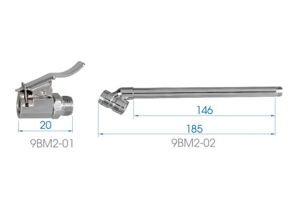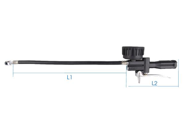 Profesjonalny pistolet z manometrem do pompowania kół. Dedykowany do napełniania sprężonym powietrzem dętek i opon wyposażonych w zawór Pistolet wyposażony jest w manometr, który umożliwia kontrolę ciśnienia powietrza w pompowanym produkcie. Przyłącze powietrza: 1/4″Podaje ciśnienie w: BAR (0–15 bar) PSI (0–220 psi) Długość wężyka 400 mm. Wymiary: l1 – fi13 x 400 mm L2 – 180 mm Karta produktu – 9bm2210