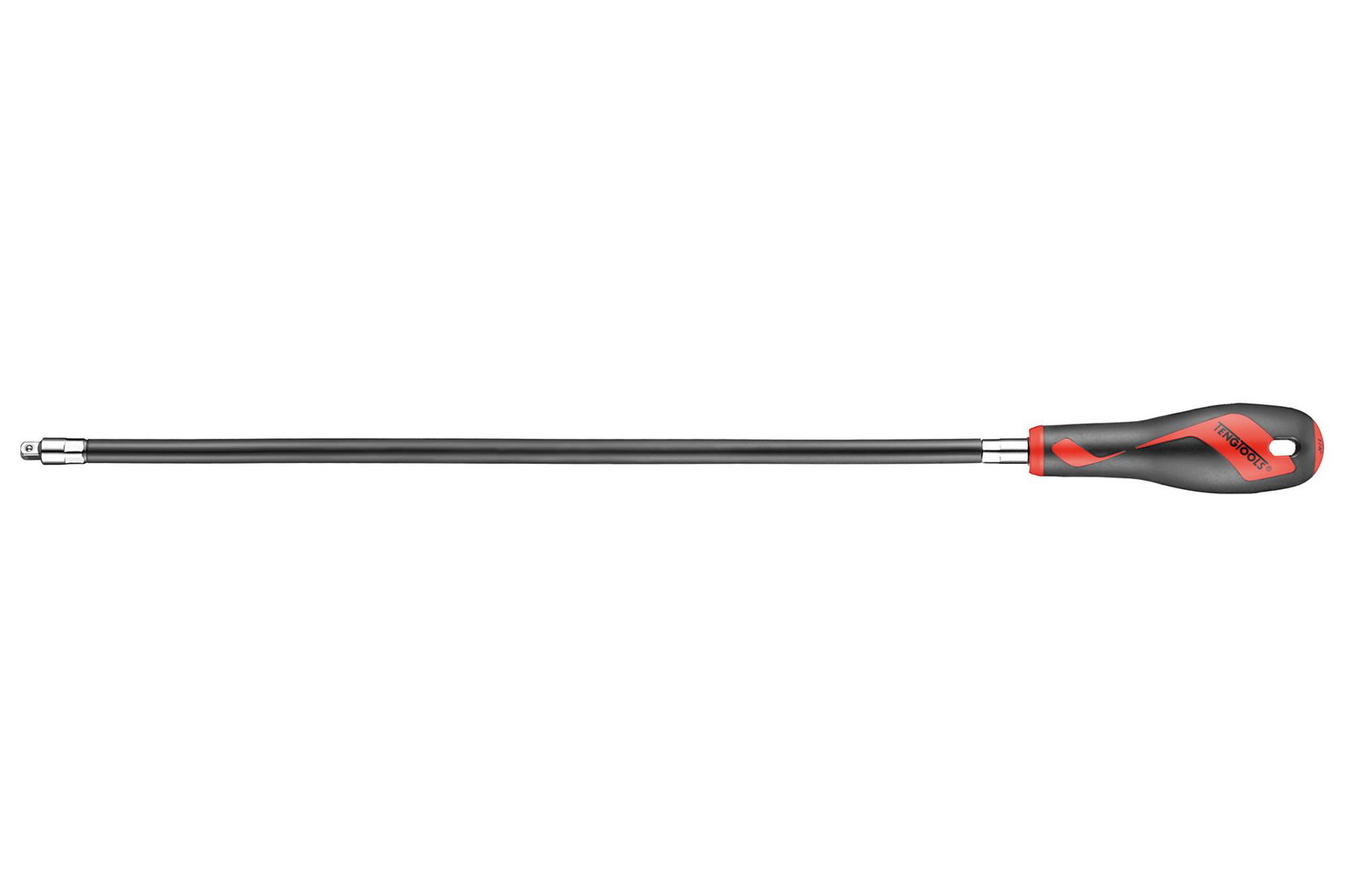 Długie, elastyczne pokrętło wkrętakowe, z chwytem 1/4″. Elastyczny trzon osłonięty jest płaszczem z tworzywa sztucznego. Rękojeść dwukomponentowa z otworem do zawieszania.