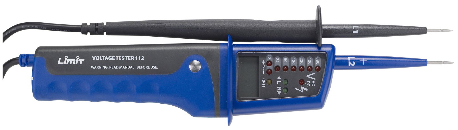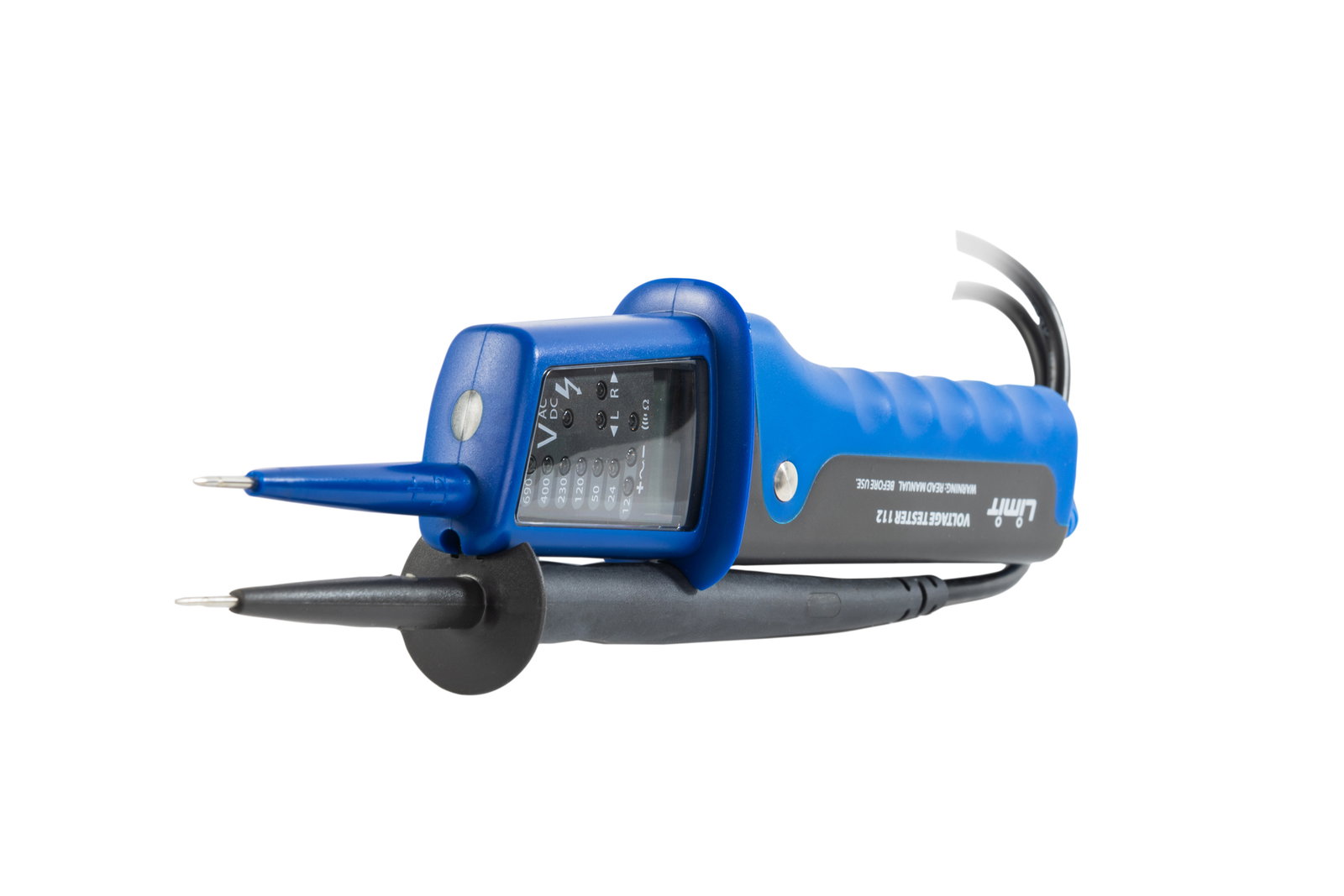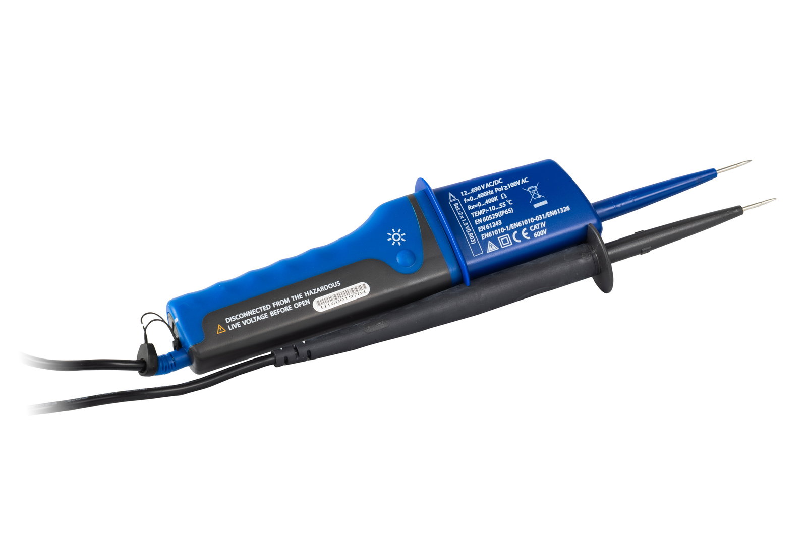 Próbnik napięcia i tester ciągłości obwodu z sygnalizacją akustyczną. Pozwala odróżnić przewód fazowy od zerowego w instalacjach jednofazowych. Test kolejności faz do kontroli kierunku obrotów silników 3-fazowych. Kontrola działania wyłączników różnicowoprądowych. Wskazuje polaryzację + lub – przy pomiarach stałoprądowych. Posiada wbudowaną latarkę. Trzymanie jedną ręką przy kontroli gniazdek ściennych. Automatyczne włączanie i wyłączanie. Dostarczany z osłonką na końcówki, bateriami i instrukcją obsługi. Izolacja CAT IV 600 V wg IEC 61010. Wodoszczelność wg IP 65. 110. Wskazanie napięcia 7-stopniowe na diodach LED 12-24-50-120-230-400-690 V. 112. Rzeczywista wartość napięcia pokazywana na wyświetlaczu, plus diody LED.
