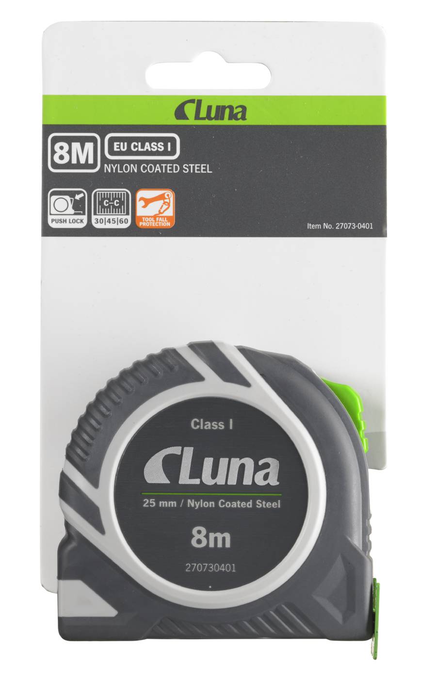 Przymiar taśmowy o bardzo wysokiej jakości, z funkcją „Push lock”. Obudowa zamknięta, z tworzywa ABS odpornego na udary i niskie temperatury. Prosta tylna krawędź obudowy, do pomiarów wewnętrznych Gumowe detale zwiększają komfort pracy i pewność chwytu. Taśma stalowa z żółtą, bezodblaskową, podwójną powłoką poliamidową, zapewniającą bardzo dobrą ochronę przed zużyciem. Na odwrotnej stronie taśmy podziałka z kreskami co 30/45/60 cm, ułatwiająca rozmieszczanie belek konstrukcyjnych. Ruchomy końcowy języczek zaczepowy i zaczep na pas. Najwyższa I klasa tolerancji. Możliwość podłączenia zabezpieczenia przed upadkiem narzędzia.