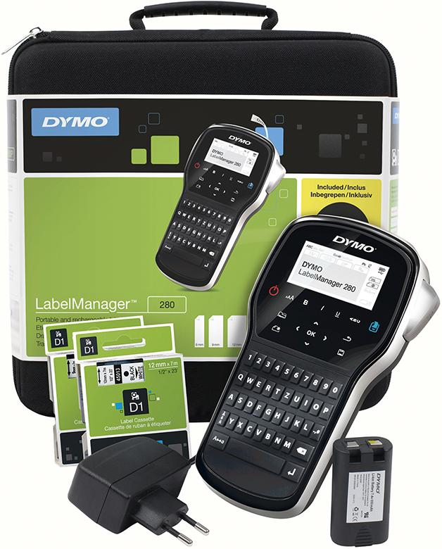 Wykonanie: Drukarka przenośna z klawiaturą QWERTZ. Łatwa obsługa, automatyczne odcinanie i naprężanie taśmy. Duży wyświetlacz z dwoma rzędami znaków, który pokazuje zastosowane efekty tekstu. 3 rodzaje czcionek, 7 krojów pisma, 6 wielkości, 9 miejsc w pamięci, symbole, drukuje do 10 kopii tej samej etykietki (etykietki DYMO® D1 o szerokości 6, 9 i 12 mm w różnych kolorach). Łatwa obróbka tekstu za pomocą przycisków skrótów. Możliwe podłączenie do PC albo Mac® (kompatybilny z Windows Vista®, Windows® 8, Windows® XP i MacOS® v.10.5 lub wyższymi – tylko Intel®) przez USB dla indywidualnych projektów etykiet. Zasilane za pomocą akumulatora litowo-jonowego.