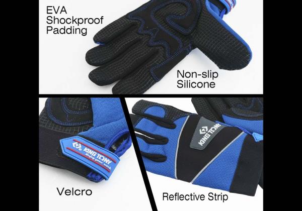 Wytrzymałe rękawice z antypoślizgowym silikonem zapewniającym doskonały chwyt. Wyściółka antywibracyjna EVA. Odblaskowe lamówki zapewniają bezpieczną pracę w ciemności. Elastyczny mankiet z rzepem zapewniający mocne dopasowanie. Długość rękawic: 247 mm, szerokość: 120 mm.
