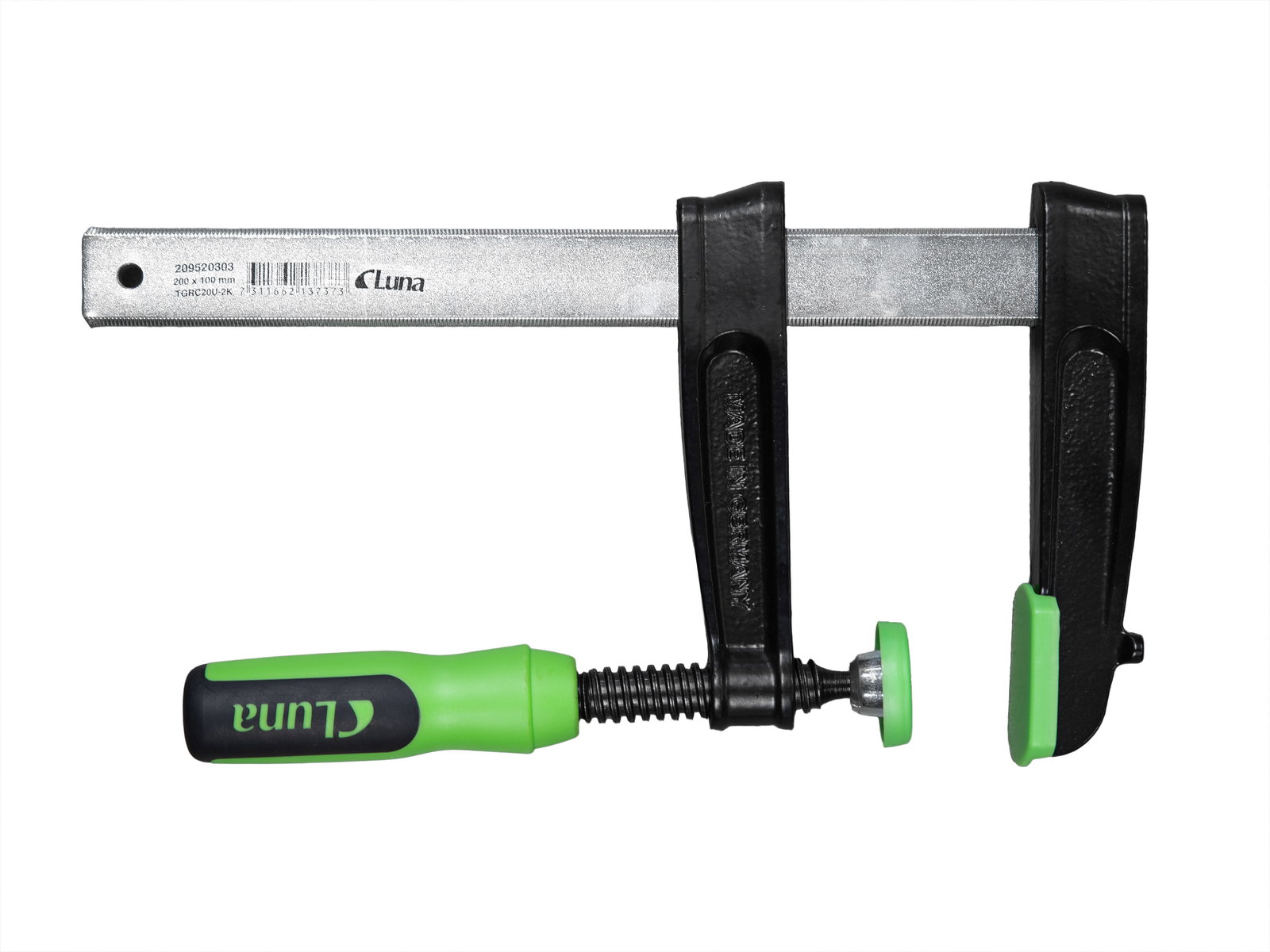 Z żeliwa ciągliwego. Szyna ze stali cynkowanej na połysk. Mocna śruba z gwintem prostokątnym, oksydowana, z płytką dociskową na przegubie kulowym, wyposażoną w kapturek z tworzywa sztucznego. Z rękojeścią dwukomponentową.