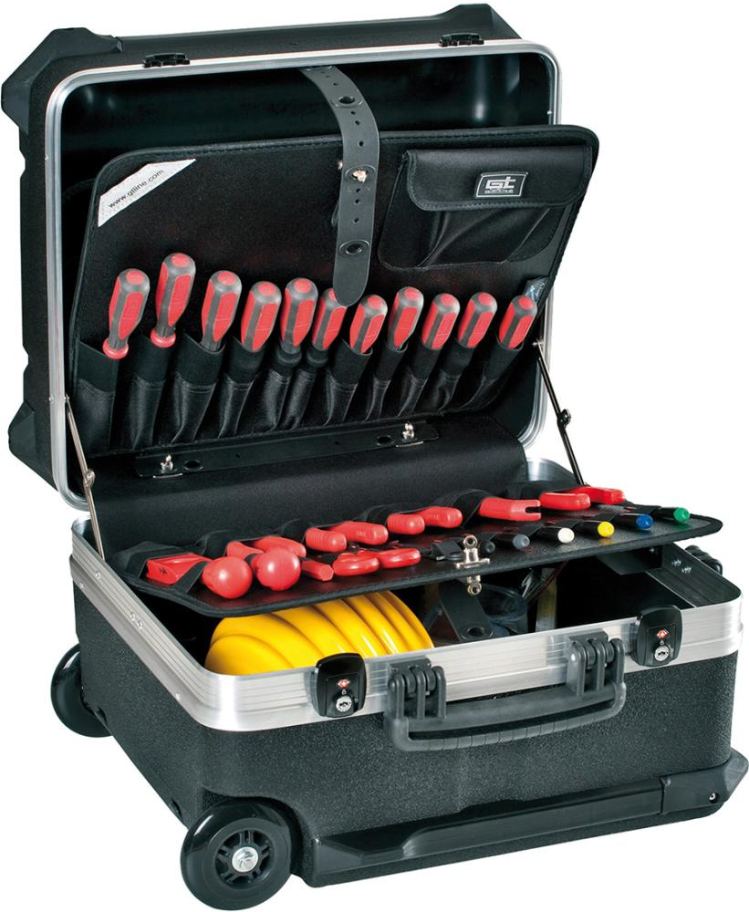 Wykonanie: z odpornego na uderzenia tworzywa sztucznego HDPE, czarna, z wytrzymałymi, wyciąganymi tablicami narzędziowymi i stabilnym uchwytem do noszenia, zapadkową, ergonomiczną rączką teleskopową i dużymi, lekko obracającymi się kółkami. Wysokość części spodniej 160 mm z możliwością dowolnego podziału wnętrza. Wytrzymałość obciążeniowa walizki do 25 kg, podwójna rama z aluminium. Bardzo stabilna, ze zintegrowanymi, zabezpieczającymi spód stopkami gumowymi. Zamykana na dwa klawiszowe zamki naciskowe TSA. Model dopuszczony do transportu lotniczego. Dostawa bez zawartości.