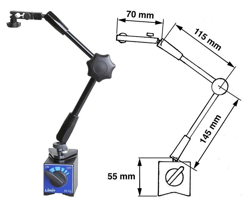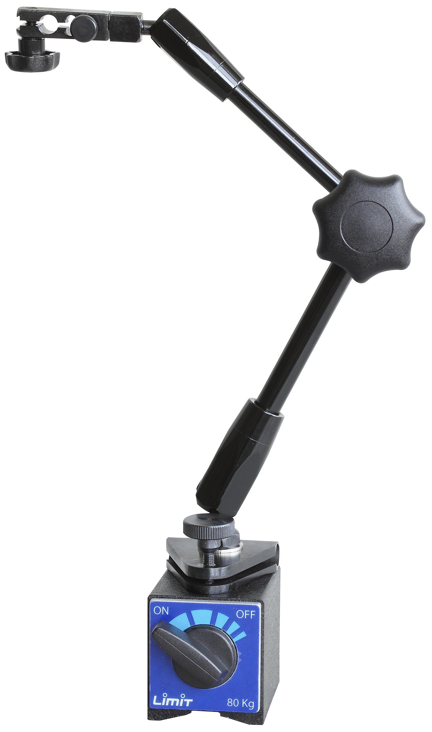 Z mechanizmem ustawiania dokładnego przy podstawie. Wyposażony w otwór na osadzenie czujnika zegarowego, oraz rowek trapezowy do czujnika wychylnego dźwigniowego. Centralne blokowanie pokrętłem jednocześnie dolnego, środkowego i górnego przegubu. Podstawa magnetyczna z rowkiem pryzmatycznym od spodu. Dostarczany bez czujnika.