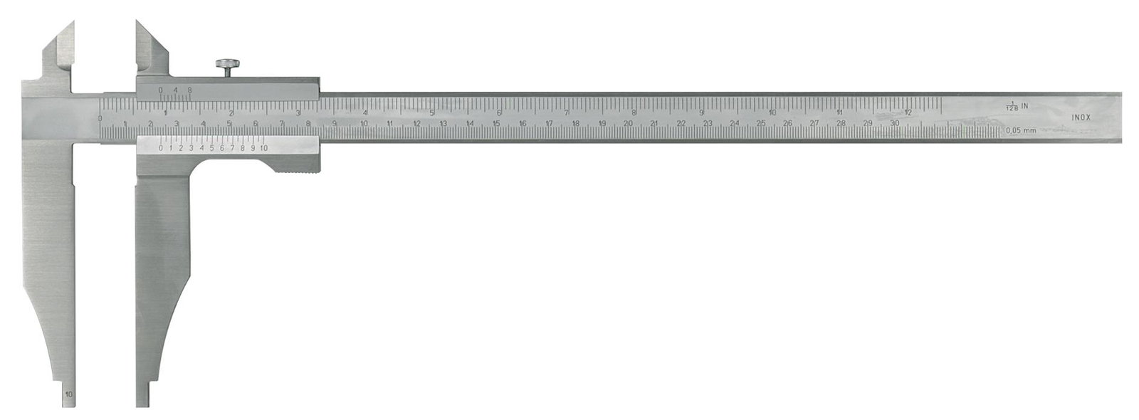 Ze stali nierdzewnej. Szczęki hartowane. Podziałka chromowana na mat. Górne szczęki zeszlifowane, dla ułatwienia wykonywania pomiarów w rowkach. Końce szczęk dolnych mają wycięcia, dla umożliwienia wykonywania pomiarów wewnętrznych. Tolerancja wg DIN 862. Noniusz 0.05 mm.