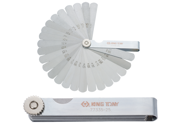 Szczelinomierze King Tony 25 sztuk. Rozmiar blaszki 13×85 mm, rozmiary 0.04, 0.05, 0.06, 0.07, 0.08, 0.09, 0.1, 0.15, 0.2, 0.25, 0.3, 0.35, 0.4, 0.45, 0.5, 0.55, 0.6, 0.65, 0.7, 0.75, 0.8, 0.85, 0.9, 0.95, 1 mm Karta produktu – 77335-25