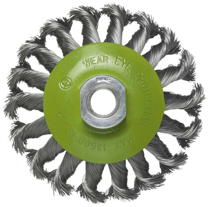 Kształt talerzowy. Ze skręconych drutów stalowych, do cięższych prac przy oczyszczaniu i obróbce powierzchni.