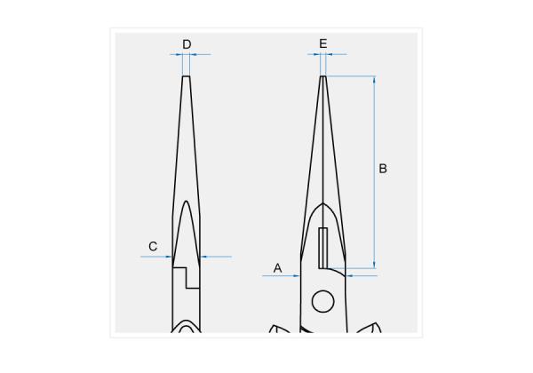 średnica cięcia: drut miękki (miedź, aluminium) – 2,0 mm , drut średnio twardy (żelazny gwóźdź) – 1,6 mm. Wymiary:A – 11,3 mm B – 30 mm C – 7,5 mm D – 1,5 mm E – 1,5 mm Karta produktu – 6377-55
