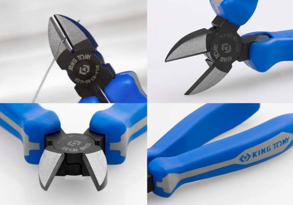 Szczypce tnące boczne typu europejskiego King Tony. Całkowita długość szczypiec 163 mm. Wygodna plastikowa rączka, możliwość cięcia przewodów do 4.0 mm w zależności od twardości Karta produktu – 6211-06