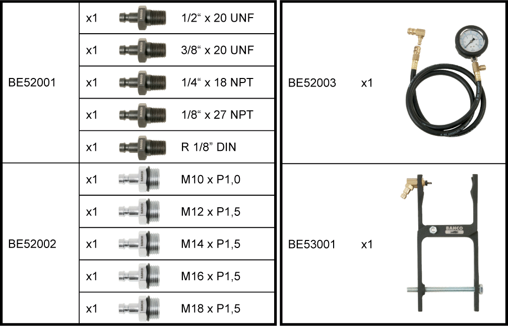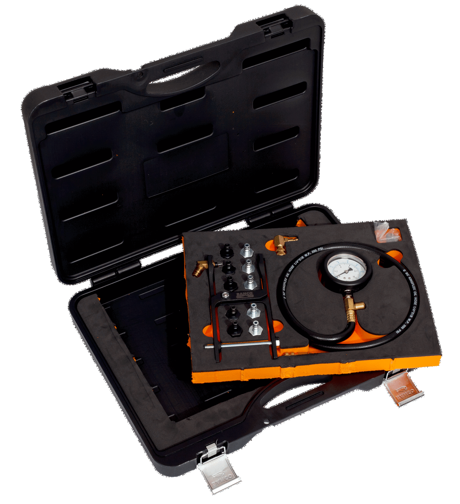 - Wąż i wskaźnik testera ciśnienia o zakresie [0-10 bar] lub [1 – 150 PSI] i Adapter 90° [BE52003]