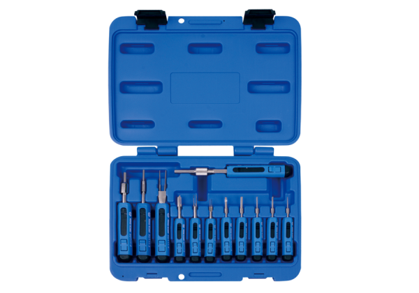 Do większości pojazdów VW Group, BMW, Opel, Renault, Ford, Fiat, Toyota, Saab. Do łatwego luzowania styków lub wykonywania innych prac w dziedzinie elektryki samochodowej. Zawartość zestawu:- A – ABS 4,0 mm złącze okrągłe- B – 3,5 mm złącze okrągłe- C – 1,5 mm złącze okrągłe- D -regulator czasowy- E – PIT POD/FASTON 6,3 mm – F – JPT/SPT- G – Mikroregulator czasowy II- H – narzędzie uzupełniające- I – standardowy 2,72 mm – J – standardowy 1,48 mm – K – standardowy 1,89 mm – L – mikro standardowy Karta produktu – 9dt11