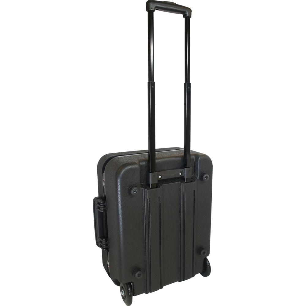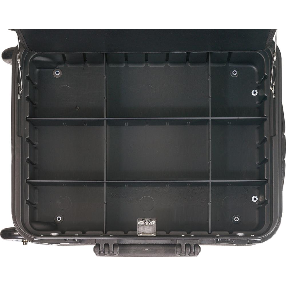 Wykonanie: z odpornego na uderzenia tworzywa sztucznego HDPE koloru czarnego, dwuścienna, z wyjmowanymi tablicami narzędziowymi i stabilnym uchwytem do noszenia, zapadkowym, ergonomicznym uchwytem teleskopowym i dużymi, lekko obracającymi się kółkami. Wysokość części spodniej 110 mm, z możliwością dowolnego podziału wnętrza. Wytrzymałość obciążeniowa walizki do 30 kg, podwójna rama z aluminium. Bardzo stabilna, ze zintegrowanymi, zabezpieczającymi spód stopkami gumowymi. Zamykana na dwa klawiszowe zamki naciskowe TSA. Walizka przystosowana do przewozu samolotem. Dostawa bez zawartości.