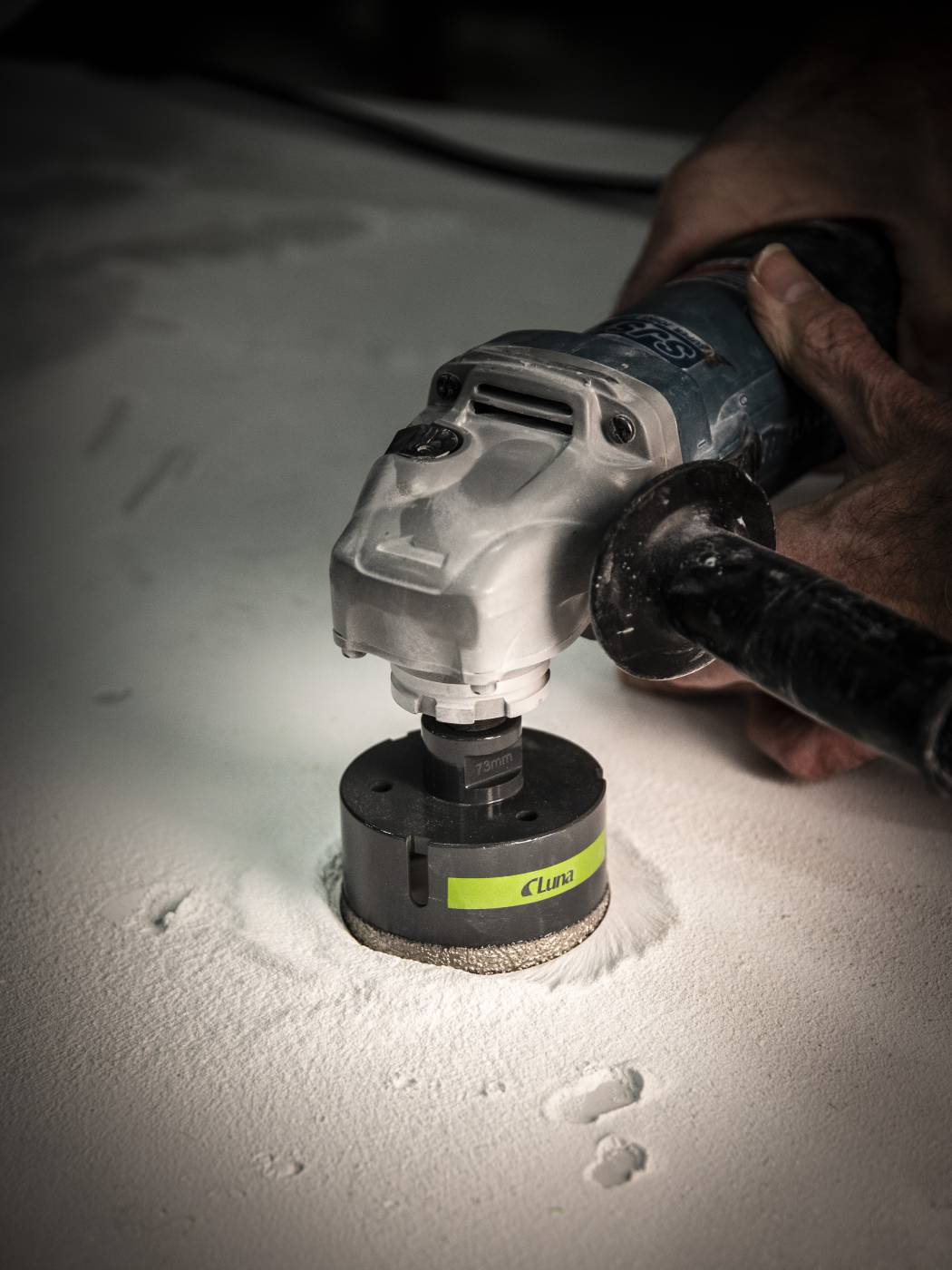 Wiertła diamentowe umożliwiające wiercenie na sucho. Z gwintem chwytowym M14 do mocowania w szlifierce kątowej. Do wykonywania otworów w glazurze, klinkierze, gresie, granicie, płytkach ceramicznych, marmurze itp. Wiertła mniejsze, o średnicy do 25 mm, należy ochłodzić wodą po wykonaniu każdego otworu. Większe wiertła nie wymagają takiego chłodzenia. Po włączeniu szlifierki przyłożyć wiertło ukośnie do płytki. Gdy wiertło lekko się zagłębi należy wykonywać narzędziem niewielki ruch okrężny. Ruch ten jest ważny aby pył powstający przy pracy był odsuwany, obniżając lokalnie temperaturę. Przy właściwym użytkowaniu, wiertłem mniejszym, tj. o średnicy do 25 mm można wykonać do 35 otworów, natomiast wiertłem większym do 100 otworów.