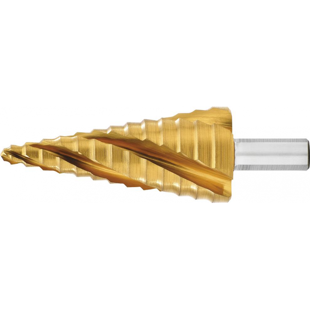 Wykonanie: innowacyjne wiertło stopniowe z 4 krawędziami skrawającymi, INNOWACYJNY POCZWÓRNY ROWEK SPIRALY, NOWY WIERZCHOŁEK TURBO TIP znacznie ułatwiający centrowanie i nawiercanie. 3-płaszczyznowy chwyt zapobiega ślizganiu się narzędzia w uchwycie wiertarskim. Z laserowym oznakowaniem średnicy otworu i prędkości obrotowej. Średnicę otworu można odczytać także na obracającym się narzędziu.
