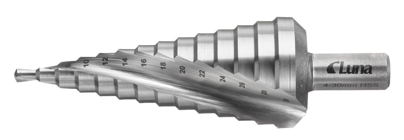 Dwuostrzowe wiertło stopniowe ze stali szybkotnącej, przeznaczone do wykonywania otworów w blachach, tworzywach sztucznych i laminatach. Pozostawia gładką powierzchnię cięcia, bez deformacji. Wierzchołek krzyżowy ułatwia centrowanie wycinanego otworu bez potrzeby uprzedniego wiercenia otworu prowadzącego. Maks. grubość blachy 5 mm (27082-0301 maks. grubość blachy 4 mm). Do bezpośredniego osadzania w elektrycznych lub akumulatorowych wiertarkach ręcznych lub w zwykłym uchwycie wiertarskim.