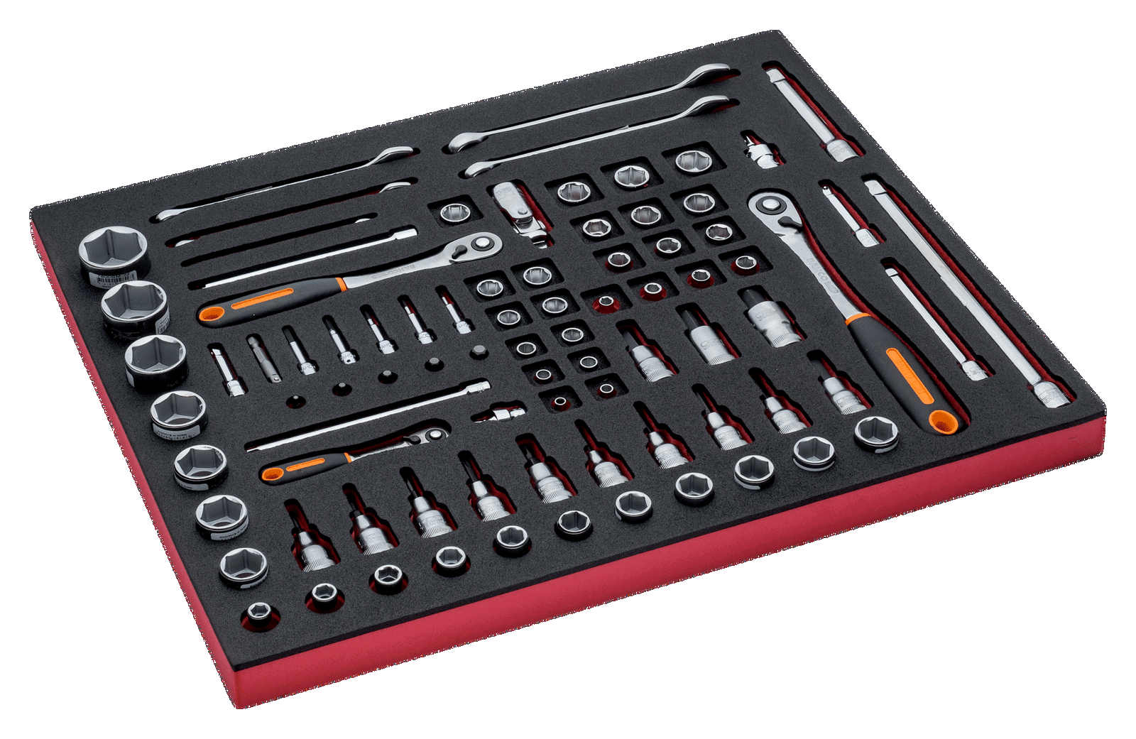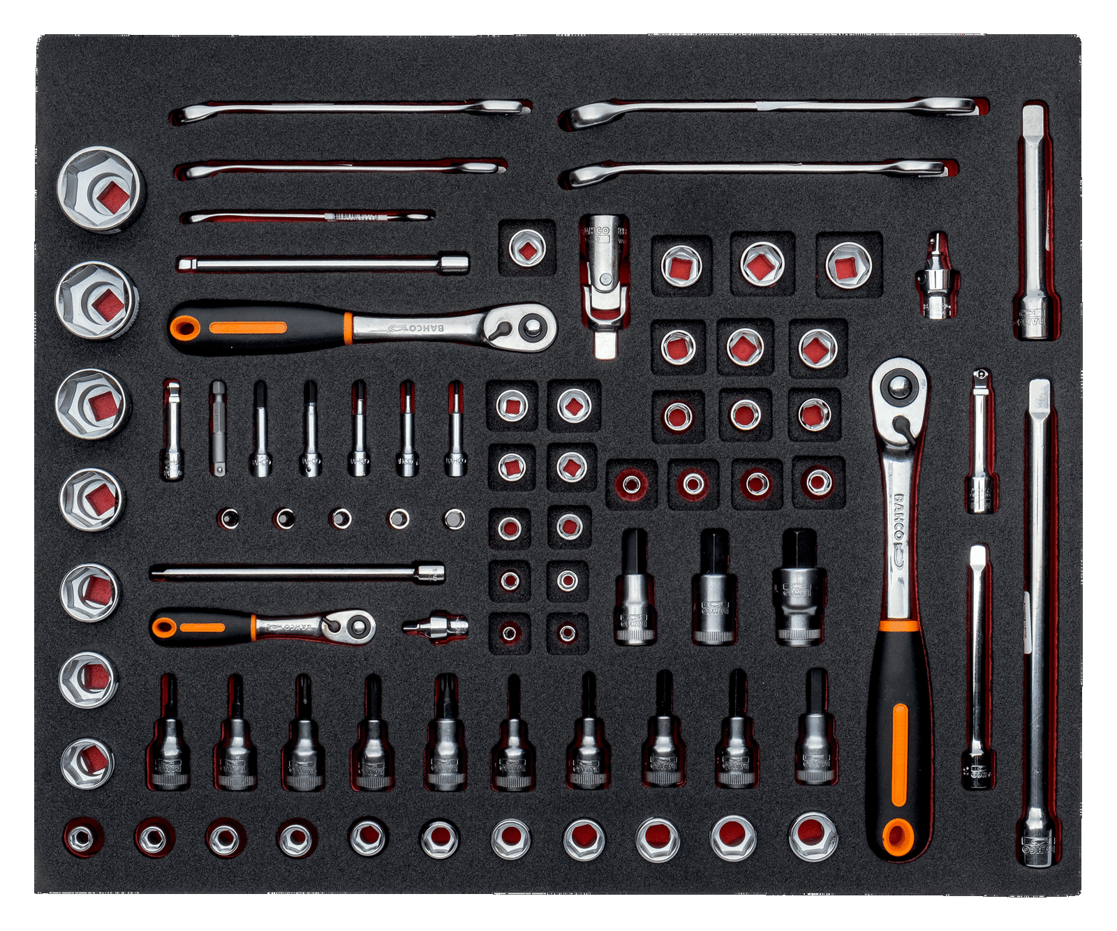 Wkład narzędziowy – nasadki 1/4″ + 1/2″ & klucze płasko-oczkowe – 83 elem. BAHCO