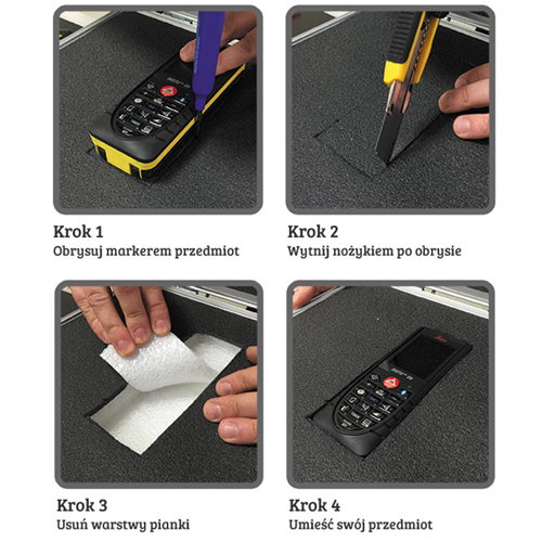 Pianka do samodzielnego formowania i wycinania miejsc na przedmioty lub narzędzia w celu zapewnienia skutecznej ochrony przed drganiami i uszkodzeniami mechanicznymi. Wymiary: 280 x 187 x 40 mm. Pianka klastrowa wielowarstwowa KYOTO Tool Foam typu Cut and Pell w systemie 5S do samodzielnego formowania i wycinania miejsc na przedmioty lub narzędzia w walizce, kufrze, szufladzie narzędziowej itp. w celu zapewnienia skutecznej ochrony przed drganiami i uszkodzeniami mechanicznymi.Warstwowa budowa gąbki umożliwia bardzo łatwe jej wycięcie nożykiem uniwersalnym i wydłubanie gąbki na żądany wymiar celem zrobienia przestrzeni na przedmiot, który chcemy zabezpieczyć czy uporządkować. Do pomocy potrzebny jest jedynie ostry nóż oraz marker obrysowy.Jakość i precyzja wycięć zależy od Twoich umiejętności manualnych. W celu osiągnięcia dokładniejszych wycięć, sugerujemy użycie dwóch nożyków z ostrzami 9 mm i 18 mm.Pianka o wymiarach 280 x 187 x 40 mm. (grubość 40 mm – 4 warstwy).